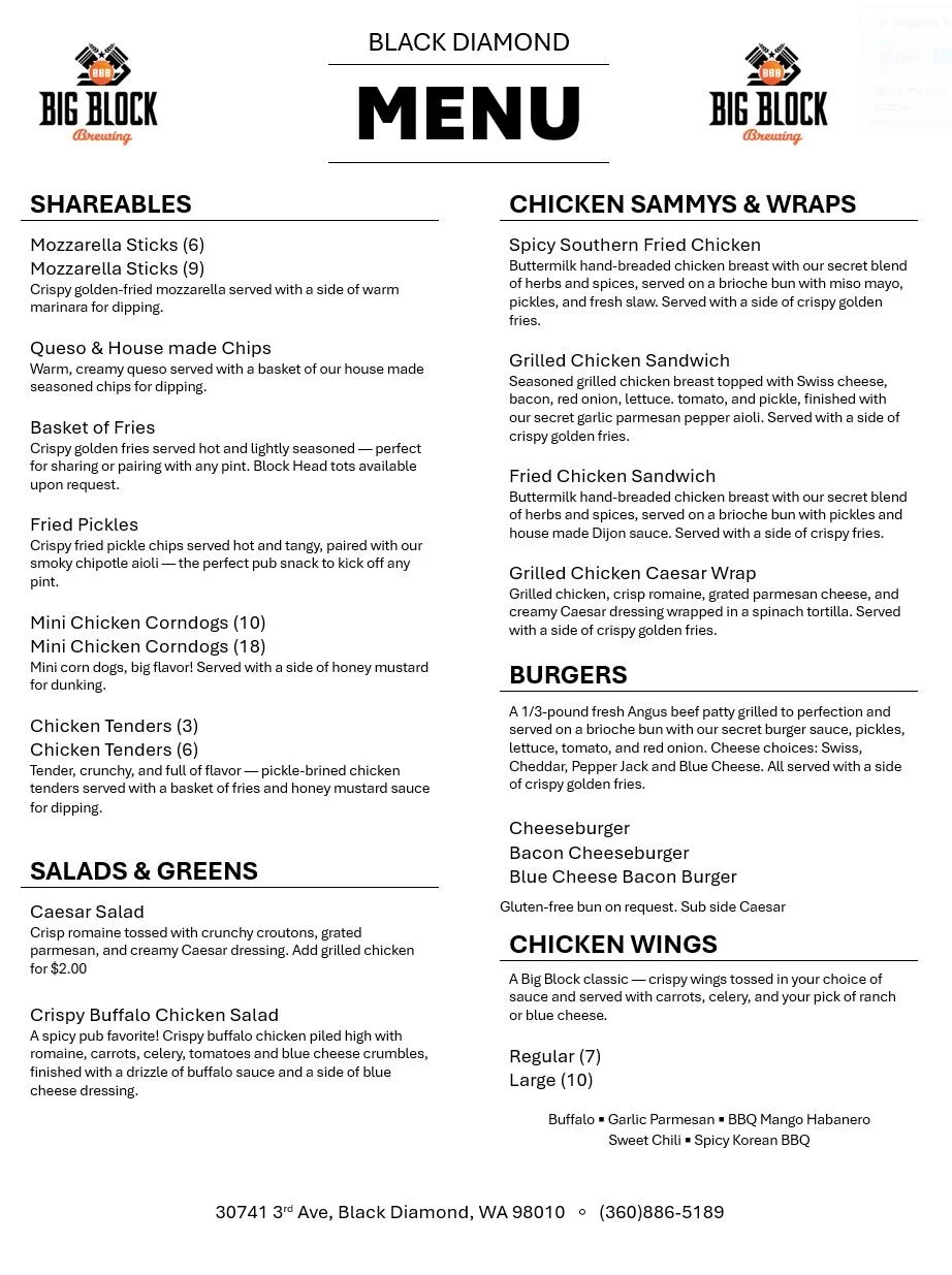 Experience Big Block Black Diamond, where every visit offers breathtaking, panoramic views of majestic Mt. Rainier paired with exceptional food and expertly crafted artisan beer. After hitting the slopes on Mt. Rainier or exploring the nearby hiking trails, there’s no better place to unwind. Savor a wide variety of carefully brewed beers, made to perfection with passion, alongside a thoughtfully designed menu created to satisfy every palate and craving. Our friendly and attentive staff welcomes you with warm, genuine service, making each visit not only comfortable but truly memorable. Whether you're here to enjoy the stunning natural scenery, indulge in great flavors, or soak in the inviting, relaxed atmosphere, Big Block Black Diamond is the ultimate destination that delivers it all. Come see for yourself why we’re consistently the top choice for both locals and visitors alike.