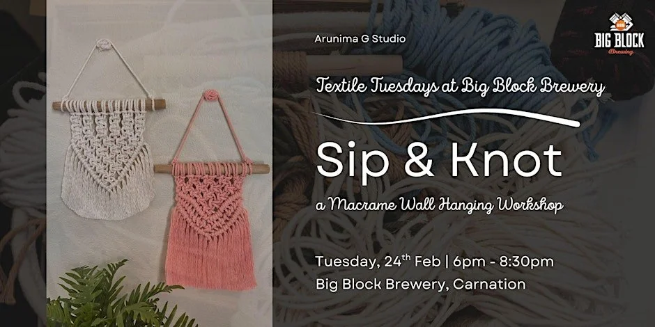 Join in for Sip & Knot: Macramé Wall Hanging Workshop, at Big Block Brewery as part of Textile Tuesdays - a relaxed, beginner-friendly evening where participants can learn a new textile skill while enjoying the brewery atmosphere.