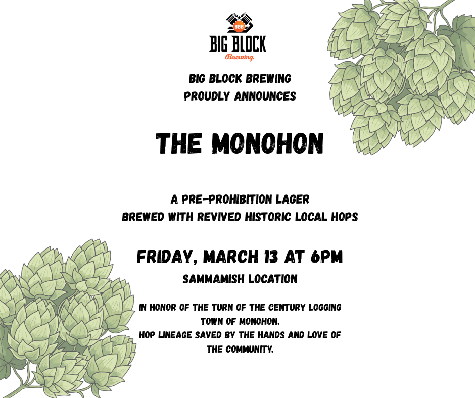 Join us at our Sammamish taproom — 3310 East Lake Sammamish Parkway SE — on March 13th at 6pm for a very special release party as we raise a glass to history, community, and the return of the Monohon.